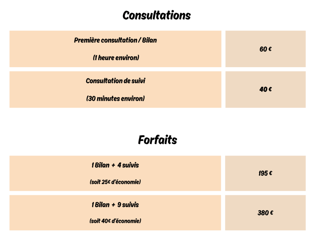 Règlement possible par carte bancaire, chèque ou espèces. Certaines mutuelles prennent en charge une partie ou la totalité du coût de la consultation diététique.
